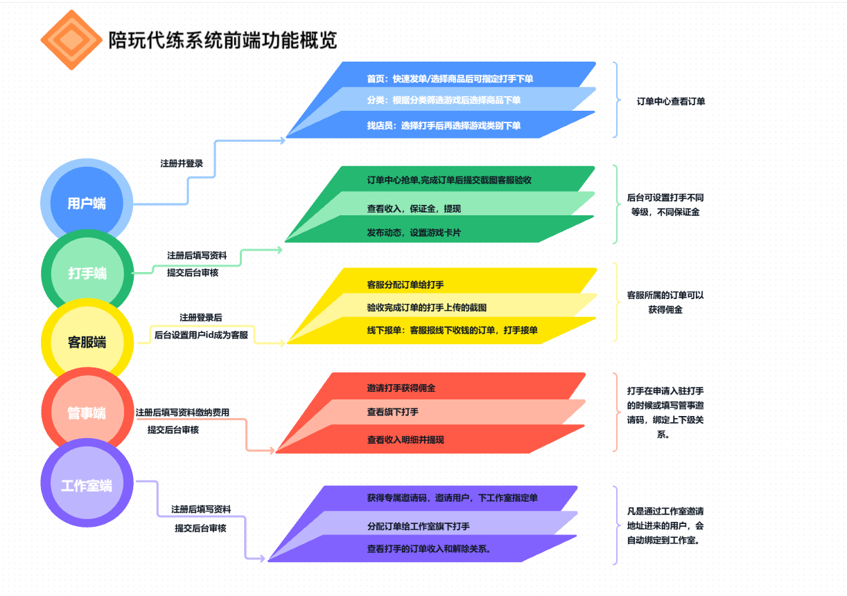 系统基于多角色权限设计,覆盖从玩家下单到打手结算的全流程,核心角色与对应功能如下(结合功能导图拆解):
