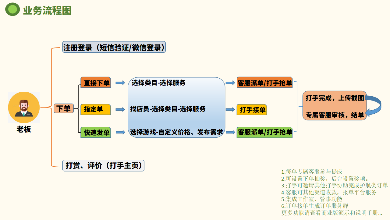 | | 平台入驻、抽佣管理、独立打手管理、私域运营、订单管理 |