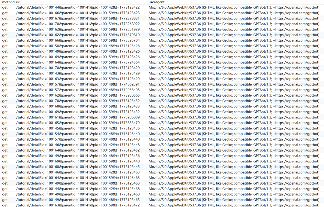 最近发现流量剧增,(千万级别)20000000+的网络请求,,查看了一下日志发现原来我的网站被OpenAI 的官方网络爬虫(GPTBot),每天OpenAI 正在抓取我的网站内容,可能是用来训练或更新其 AI 模型(如 GPT-4、ChatGPT 等),为了杜绝这个非法请求,我特意写了个脚本!