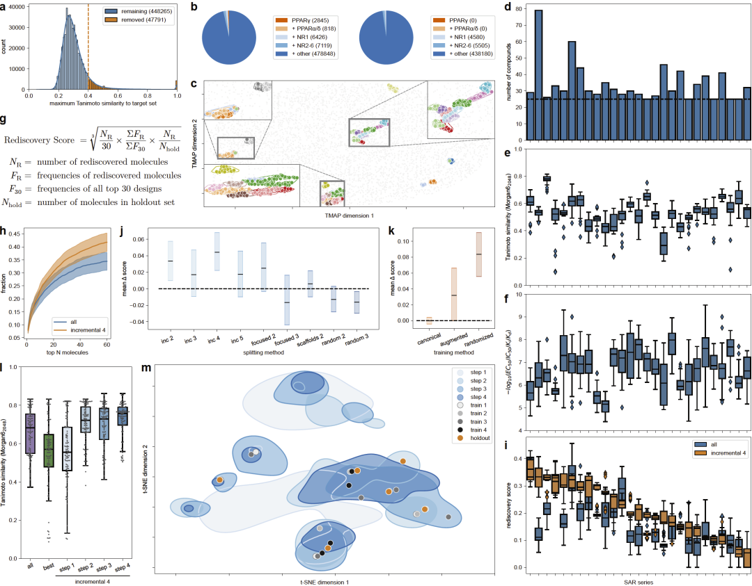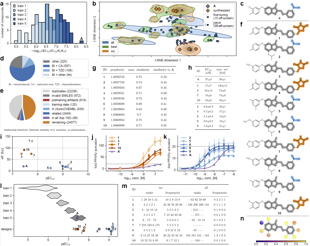 在评估方面,研究人员设计了一种“再发现评分”,用于衡量模型是否能够生成未见过但高活性的分子。同时,通过perplexity分析模型对分子的偏好变化。该方法在两个靶点上进行了验证:PPARγ和RORγ。