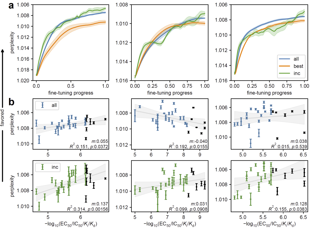 图5: 渐进式微调提升模型在高活性分子上的困惑度表现及整体活性–困惑度相关性。