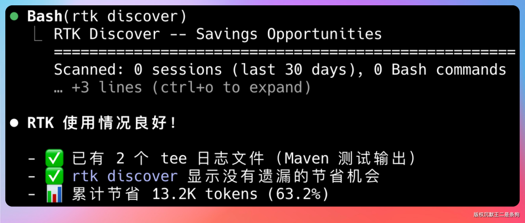 重启AI编程工具即可生效,后续执行命令会自动被RTK处理,无需额外操作。