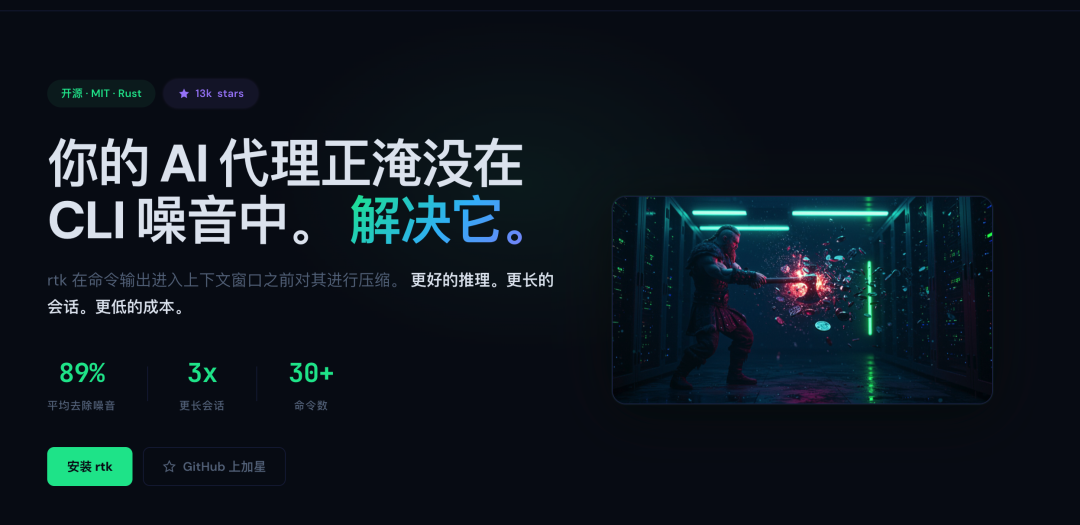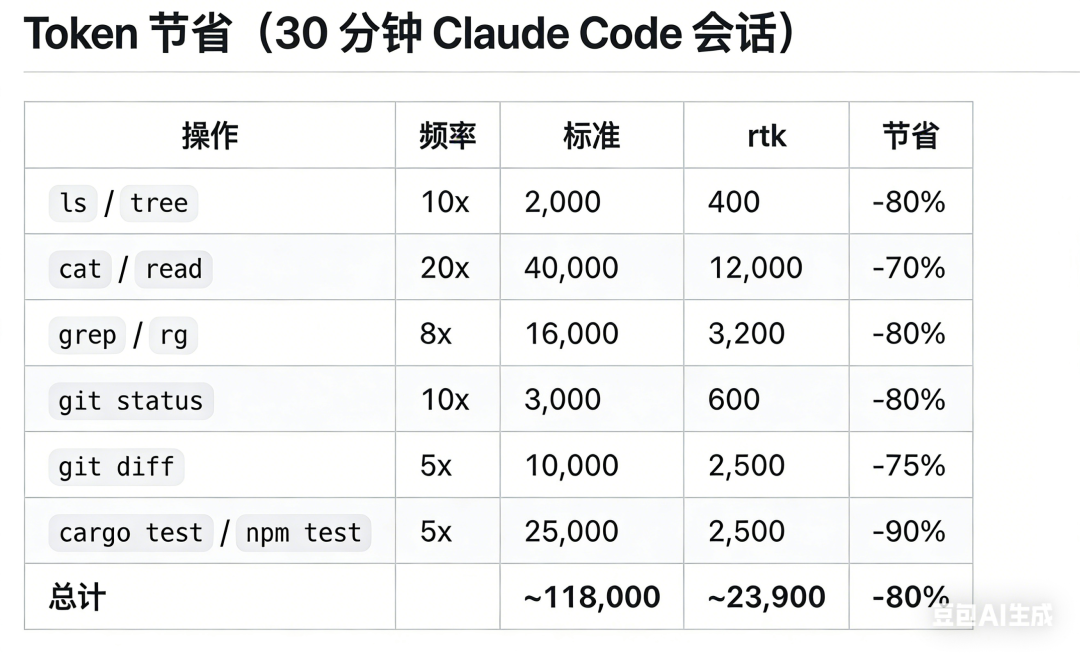 而RTK(Rust Token Killer)这款开源工具,恰好解决了这个痛点。作为用Rust编写的CLI代理,它能在命令输出到达LLM之前智能压缩,官方实测30分钟的Claude Code会话,token消耗从11.8万降至2.39万,最高节省比例达89%,堪称AI编程的"省钱神器"。