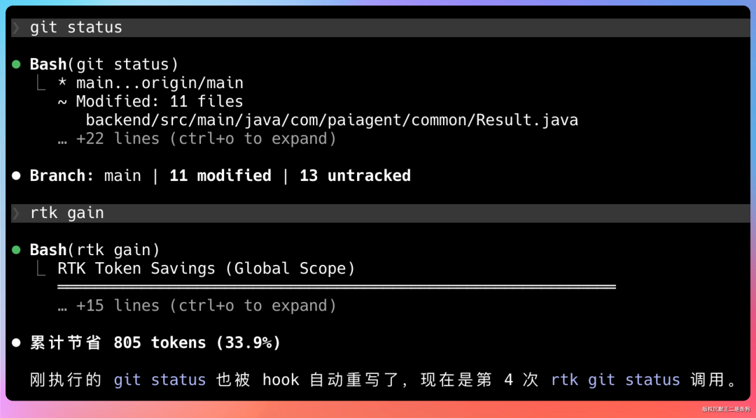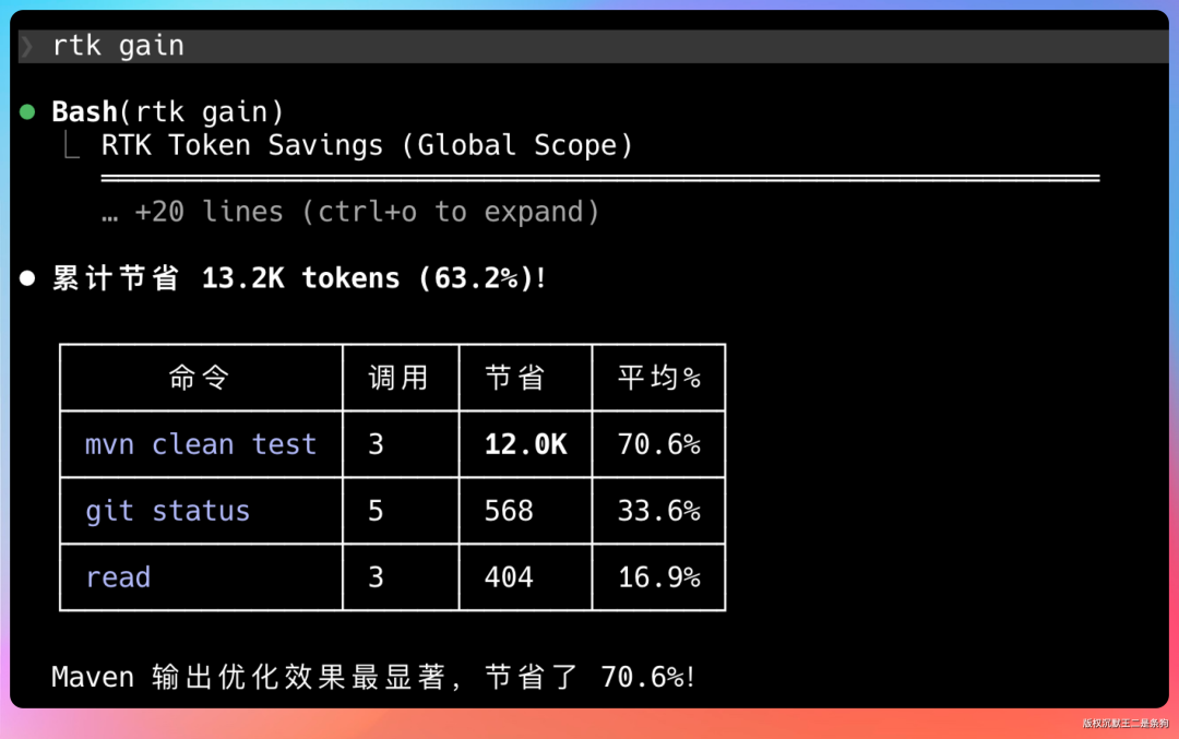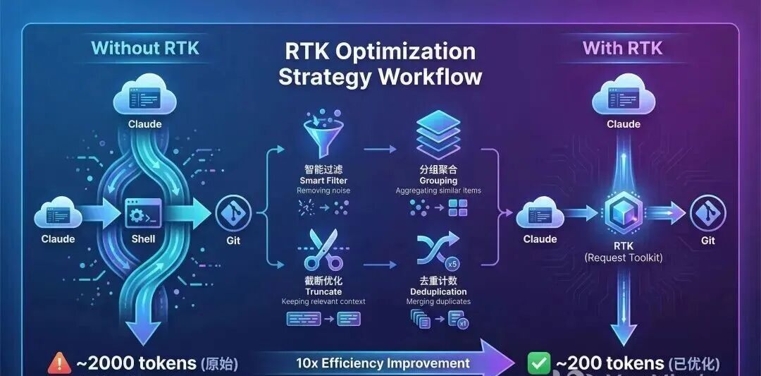 用Claude Code写代码的开发者,大概率都有过账单惊魂时刻——明明只开发了几个小功能,token消耗却高得离谱。排查后发现,真正的"吞金兽"不是核心代码,而是那些冗余的命令输出:npm install的几百行依赖树、cargo test刷满屏的通过日志、git status的超长文件列表,这些对AI决策没用的"噪音",却占据了80%以上的token配额。