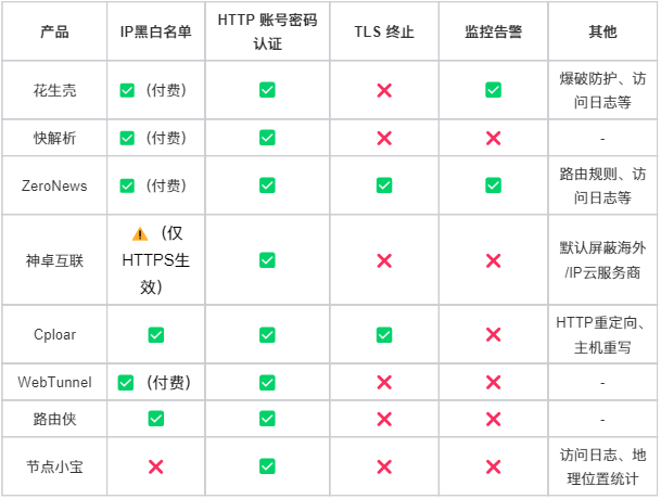 ZeroNews(零讯) | https://docs.zeronews.cc/ | 企业级组网型 | 中 | 付费为主 | HTTP/HTTPS | SSL加密、TLS终结、DDoS防护 | 企业内网代理、内容过滤 |