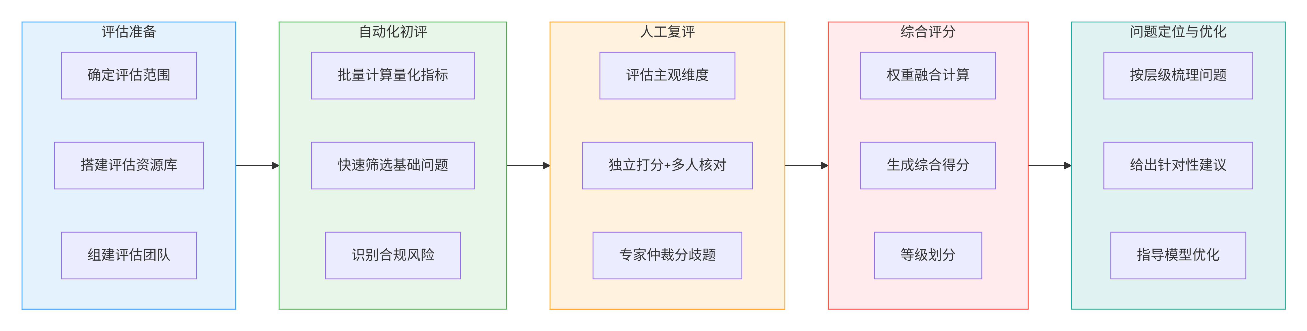 • 量化为主,质化为辅:基础语言能力、场景落地效果尽量用可计算的量化指标衡量,文化意境、价值观适配等偏主观的维度用标准化人工评估补充;