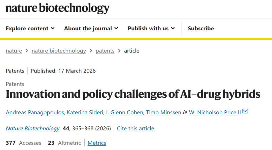 2026年3月17日,克里特大学、哈佛大学、哥本哈根大学等机构的研究人员在《Nature Biotechnology》上发表文章,题为“Innovation and policy challenges of AI–drug hybrids”。