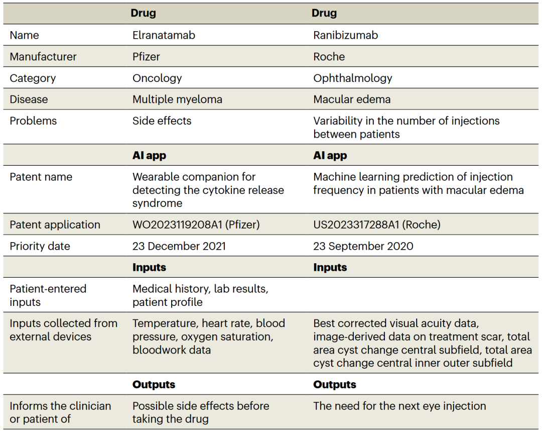 研究AI与药物之间的耦合并非易事。尽管有大量文献探讨AI如何与药物递送系统协同工作,企业也公开表示对AI的兴趣,但市场上尚无内置AI的药物。然而,专利申请却展现了不同的图景。专利是创新的重要早期指标,有助于开展前瞻性扫描,发现重大发展的早期迹象,从而帮助政策制定者管理风险、把握机遇。专利申请表明,未来AI将与特定药物协同工作,仿佛它们是一个整体产品。研究者将此类产品称为“AI-药物混合体”。在这些混合体中,AI应用以无监督的方式持续与药物协调运行,独立提供定制化的预测,以增强药物的安全性和/或有效性。例如,考虑分别由辉瑞和罗氏提交的专利申请WO2023119208和US2023317288A1,其技术、配套药物及范围概见表1。