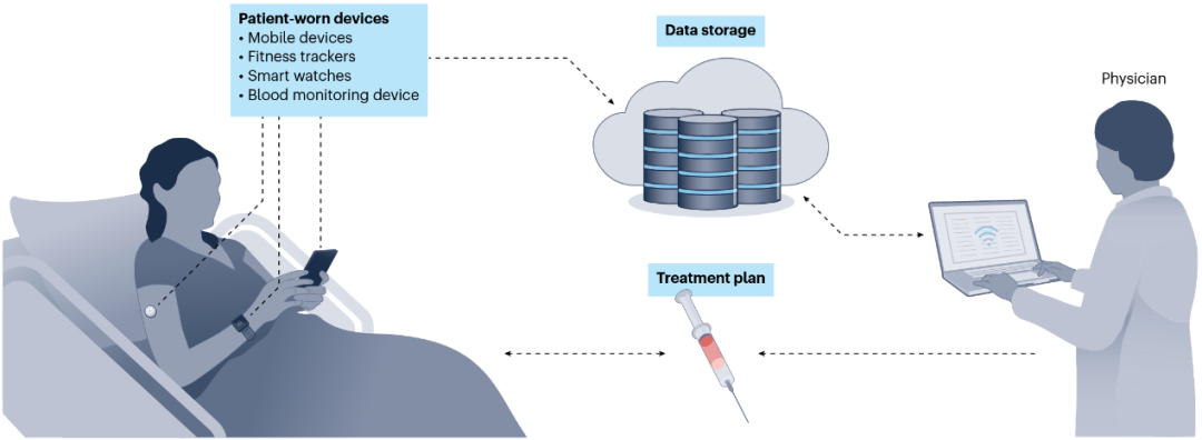 辉瑞的专利申请WO2023119208针对其双特异性抗体药物埃兰他单抗(elranatamab)。该药用于治疗多发性骨髓瘤,但因副作用较大,目前仅被批准作为最后治疗手段。根据专利申请摘要,该技术描述了一种“数字药物”,患者可下载并开始使用,包括可穿戴设备及其应用、移动设备应用等。利用从这些设备被动收集的数据,AI使患者或临床医生能够了解每次使用埃兰他单抗时是否会出现副作用。这有助于临床医生判断特定副作用是在好转还是恶化,从而调整患者服用的药物剂量,决定让患者出院进行居家监测,还是留在医院观察。具体操作模式为:治疗前,应用获取来自各种追踪设备(手机、健身追踪器、智能手表、血液监测设备)的输入数据,评估副作用的严重程度,并通知医生,使其能够决定是调整剂量、让患者出院,还是将患者留在医院观察。图1概述了埃兰他单抗的操作模式。