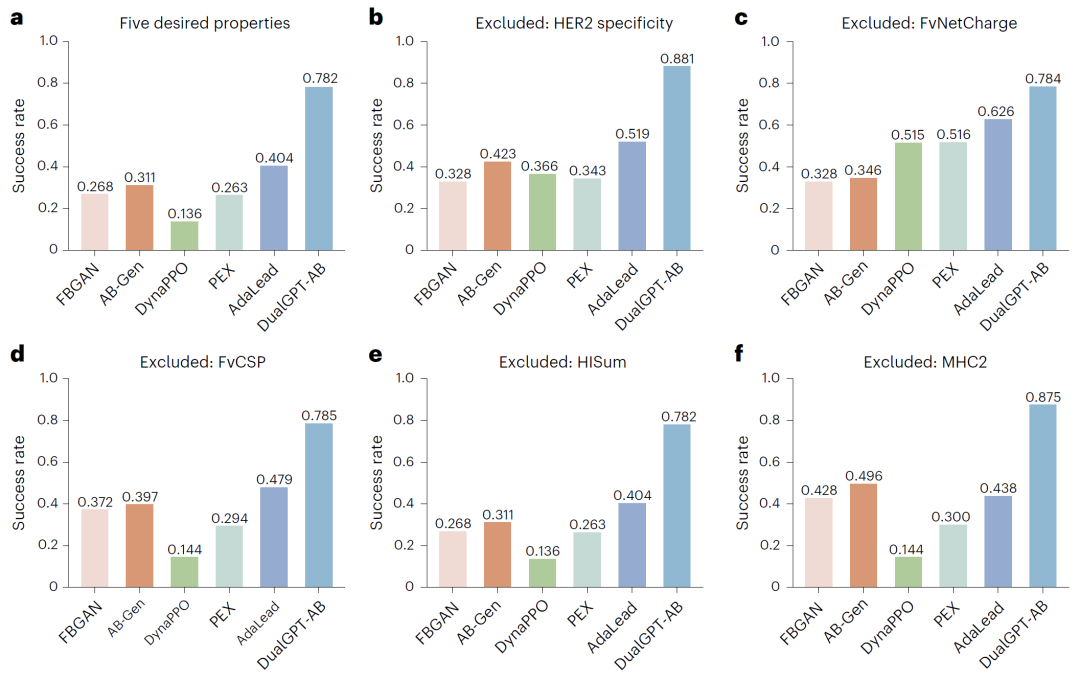 在多属性约束条件下,DualGPT-AB显著优于现有方法。在生成的抗体序列中,同时满足所有五项关键属性的比例达到78.2%,远高于其他方法。