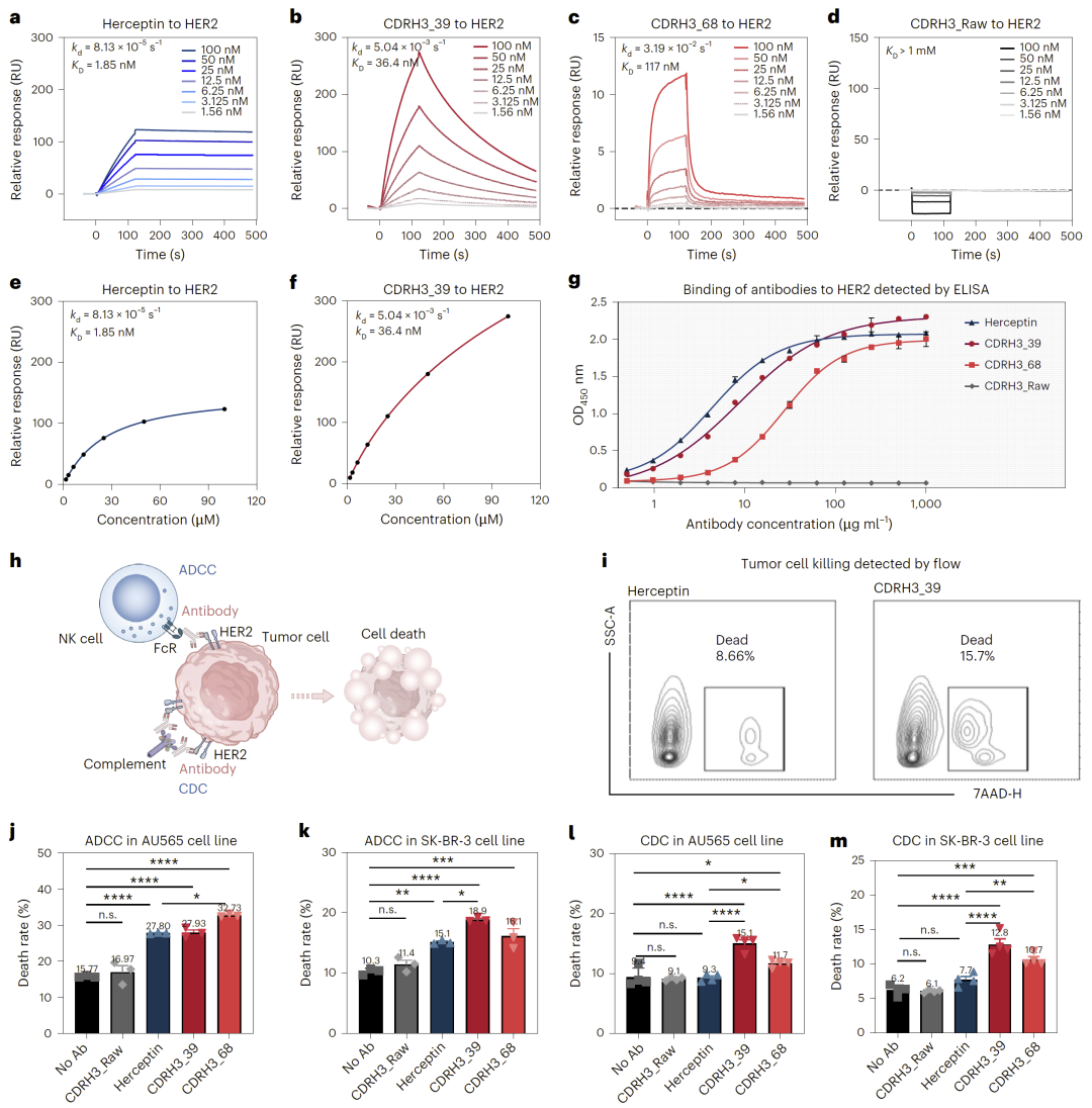 在体外实验中,研究人员验证了部分候选抗体的功能。结果显示,设计抗体不仅具有良好的HER2结合能力,还在细胞毒性实验中表现出优于Herceptin的肿瘤杀伤能力。