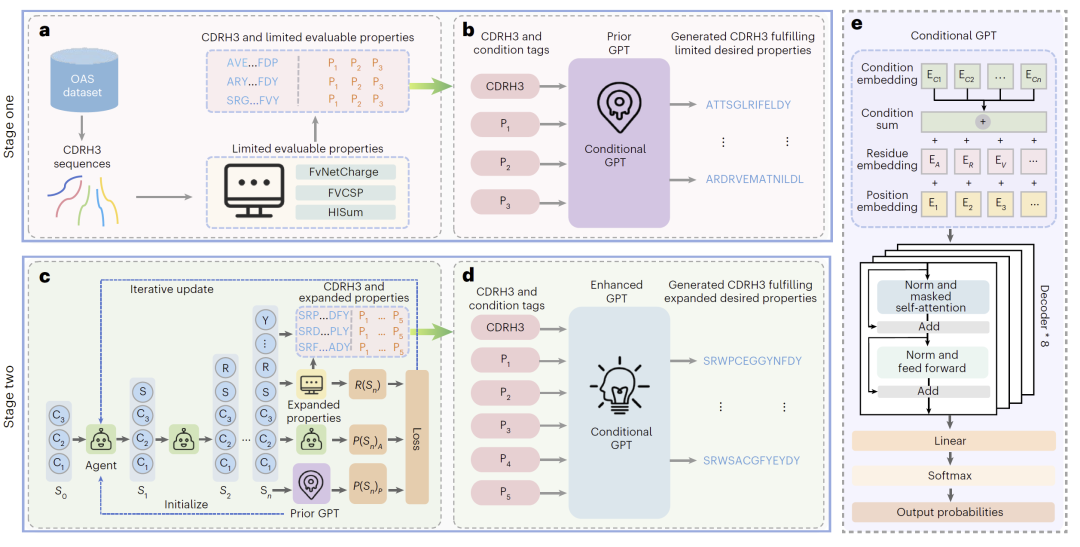 研究人员构建了DualGPT-AB框架,其核心是一个双阶段条件生成模型。在第一阶段,利用大规模抗体数据库构建带有限属性标注的数据集,训练一个初始生成模型,使其能够生成满足基础属性的序列。在第二阶段,引入强化学习,通过奖励函数引导模型在更复杂的多属性空间中探索,并逐步构建包含扩展属性的数据集。