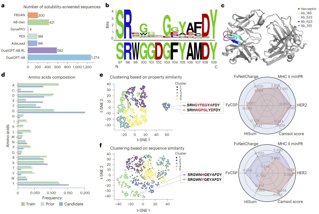 研究人员利用DualGPT-AB生成大规模抗体序列库,并通过溶解性筛选获得高质量候选集合。分析显示,该序列库在关键残基位置具有明显保守性,同时整体结构具有较高多样性。