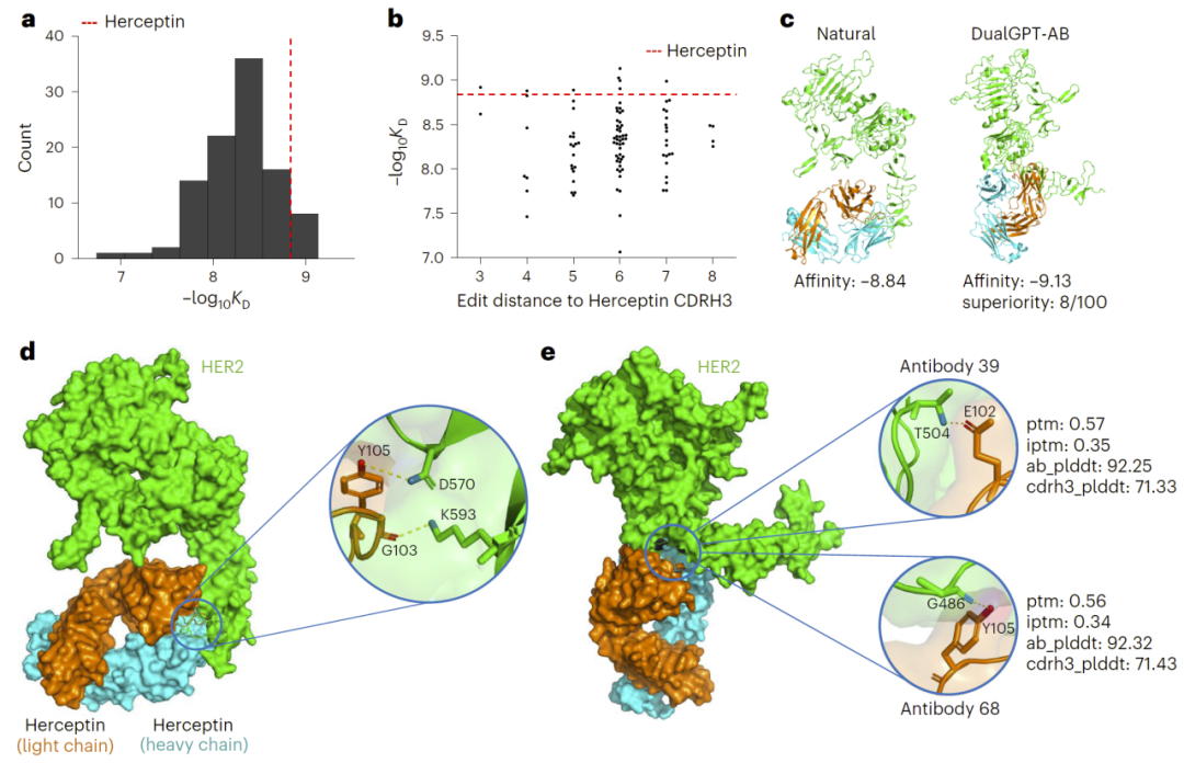 通过结构预测与结合能计算,研究人员评估了生成抗体的结合能力。在随机选取的100个候选中,超过一半表现出与Herceptin相当的结合能力,部分甚至更强。