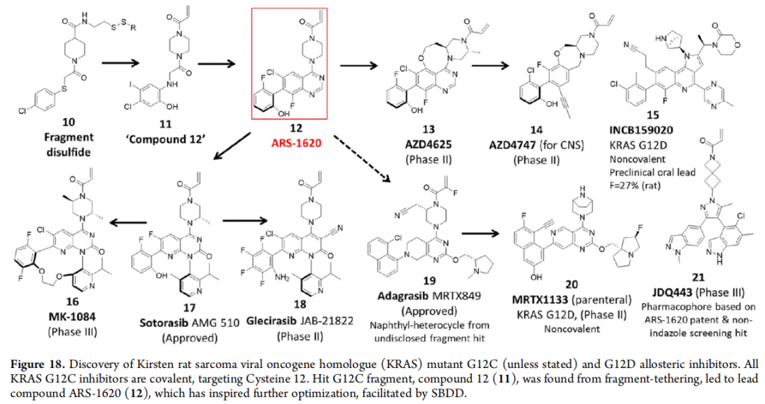 从2013年Shokat课题组发现G12C共价抑制剂(fragment tethering,化合物11)到ARS-1620(12),再到:
