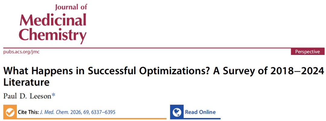 来源:What Happens in Successful Optimizations? A Survey of 2018–2024 Literature, Paul D. Leeson, Journal of Medicinal Chemistry 2026 69 (6), 6337-6395 作者:Paul D. Leeson(Paul Leeson Consulting Ltd) DOI:10.1021/acs.jmedchem.5c03171