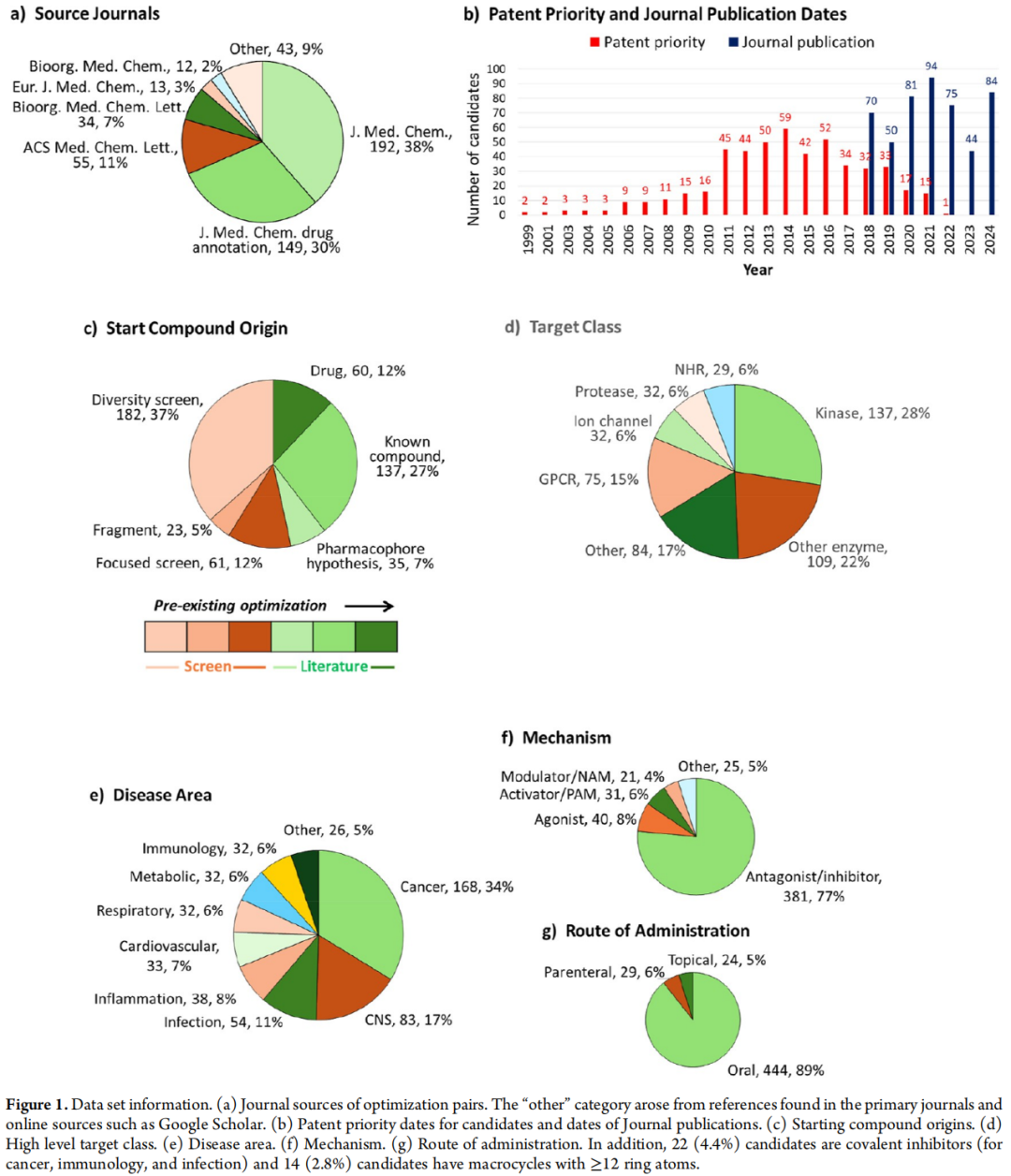 本文作者 Paul Leeson 自2018年起,历时数年,从2018—2024年的药物化学文献中手工阅读并筛选,最终收集了 487对起始化合物→候选药物的优化对(start-to-candidate pairs),涵盖498个候选药物,是迄今为止从公开文献中构建的最大规模此类数据集。