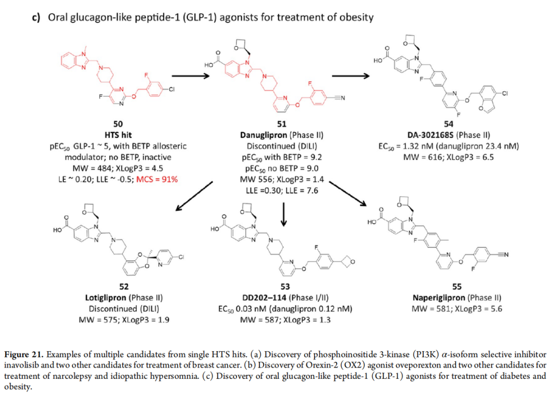 Danuglipron(51)来自一个仅在BETP激活的GLP-1蛋白上有微弱活性的HTS苗头(50),但MCS高达91%——优化几乎保留了全部起始骨架,核心改变是在苯并咪唑5位引入羧基模拟GLP-1底物的酸性残基。该案例是"高质量苗头→高MCS优化"的绝佳示范。
