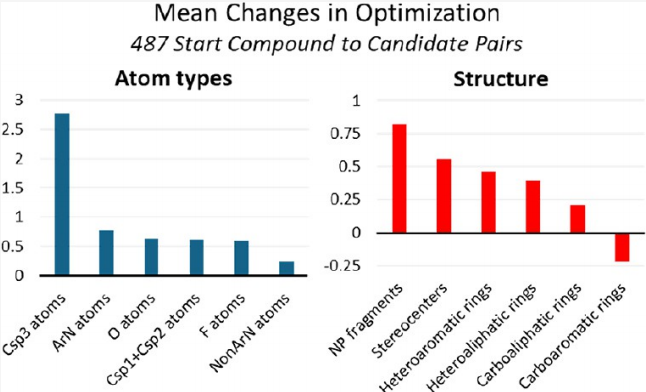 激酶起始化合物具有最高的杂芳香环密度,但在优化过程中杂芳香环密度下降,与其他靶标类别(均为增加)相反。这是因为激酶苗头化合物通常富含杂环(针对ATP结合口袋的已有认知),优化过程反而需要引入更多脂肪性成分来改善选择性。