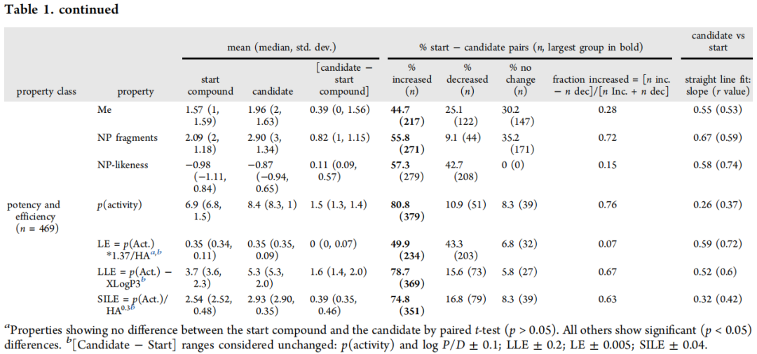 性质 | 起始化合物(均值) | 候选药物(均值) | 变化量 | 增加概率 |