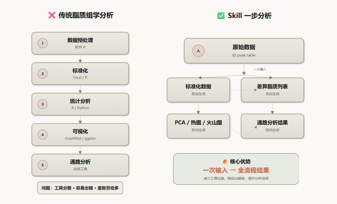 如果把脂质组学分析流程拆开来看,传统方式和 Skill 方式之间的差别其实非常明显。