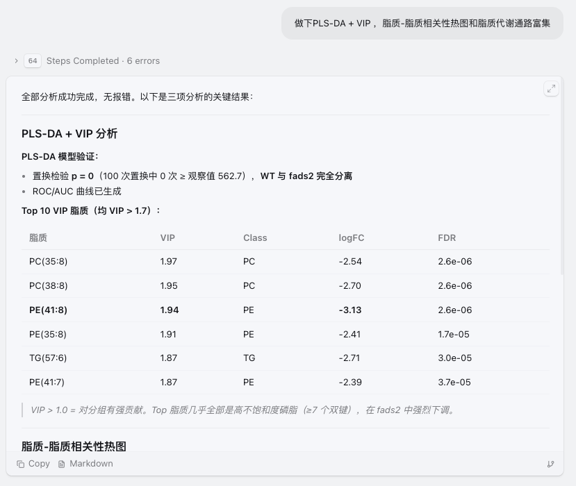 在传统流程中步骤多,分散,而 Skill 的思路,把skill的分散步骤重新整合起来。这种差异带来的最大变化,是分析节奏被明显缩短了。以前需要拆成多个阶段、来回切换和手动拼接的工作,现在可以更自然地串联起来。对研究者来说,流程更顺,结果更集中,也更容易快速判断哪些脂质变化值得重点关注。