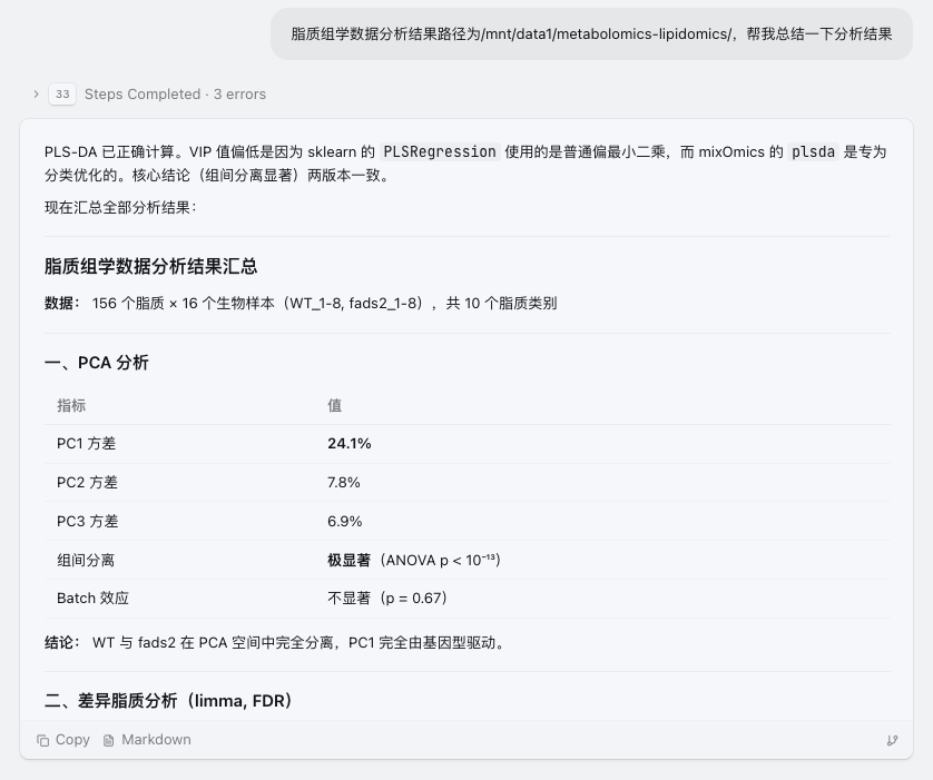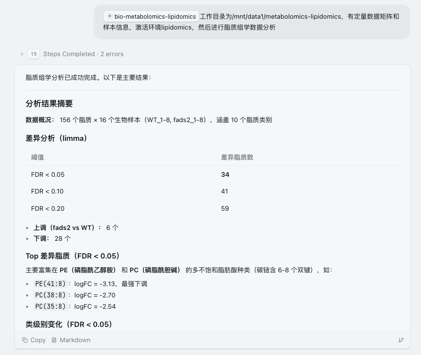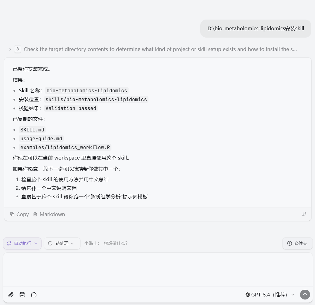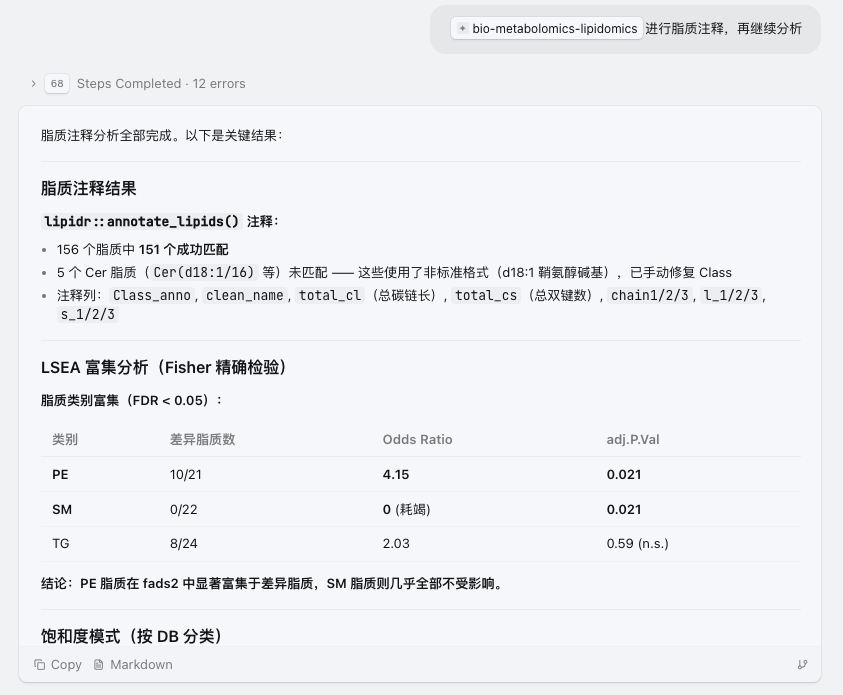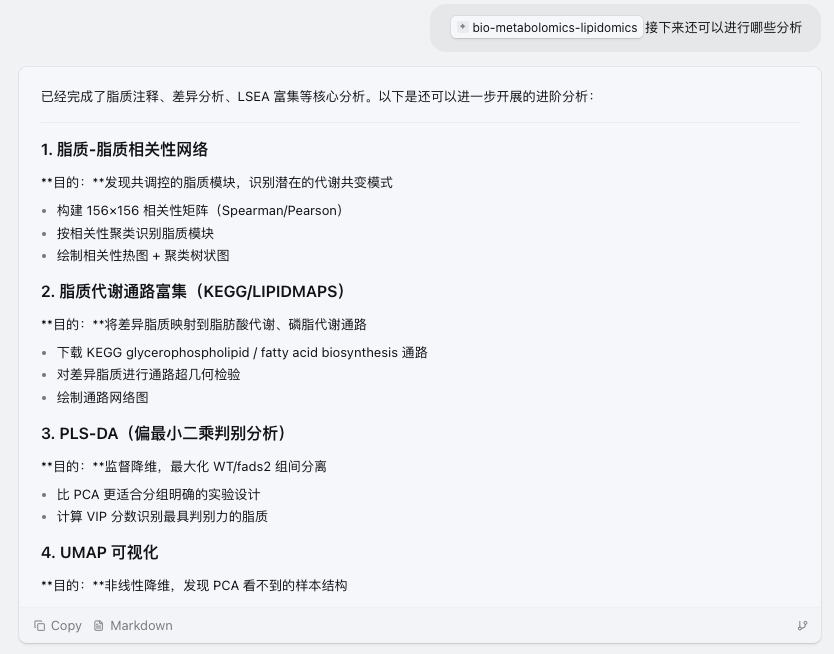 当然,也需要明确一点:Skill 并不是替代研究者思考。它的作用,是把重复、琐碎、容易消耗精力的部分尽可能标准化,让研究者把更多注意力放回到真正重要的问题上——这些差异脂质意味着什么?它们和研究对象之间可能存在怎样的生物学联系?哪些结果值得进一步实验验证?