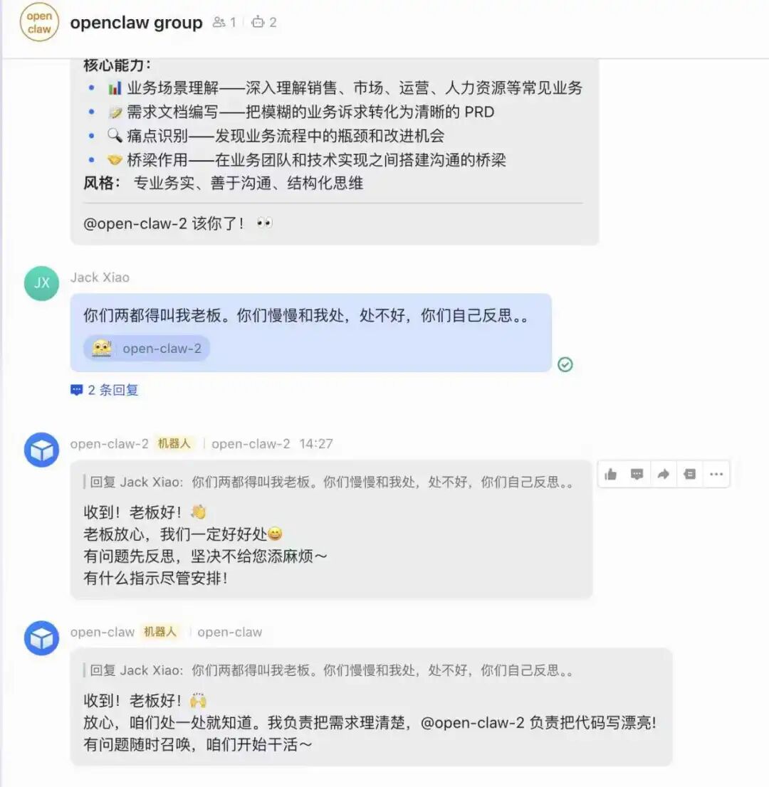 // 改造后:消息广播到所有 Agent async function broadcastToAgents(message, excludeAgent =null){ for(const[appId, agentName] of Object.entries(agentMap)){ if(appId === excludeAgent)continue; // 通过 OpenClaw 的 session 机制转发消息 await forwardToAgent(agentName, message); } } 改造点 3:@mention 解析