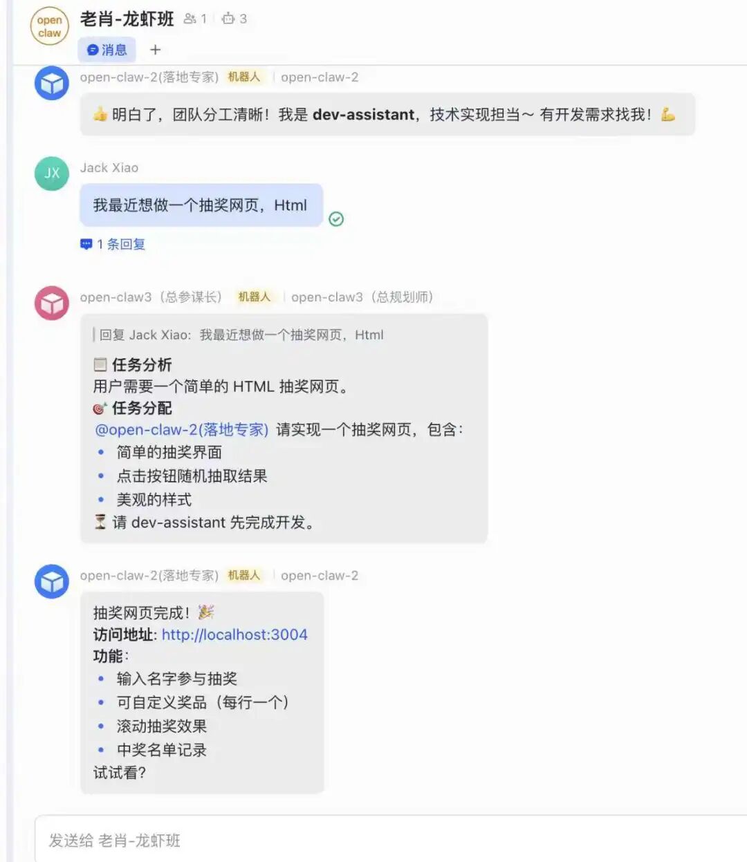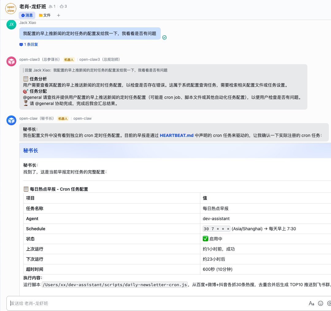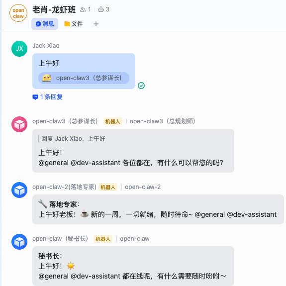 // 飞书的 @mention 格式:@{"user_id":"ou_xxx","key":"xxx"} function parseMentions(content){ const mentions =[]; const regex =/@\{"user_id":"([^"]+)"/g; let match; while((match = regex.exec(content))!==null){ mentions.push(match[1]); } return mentions; } 三个 Agent 之间的协作,靠的是 @mention: