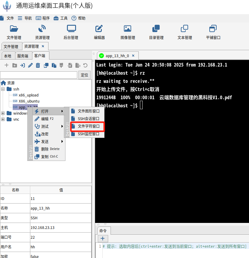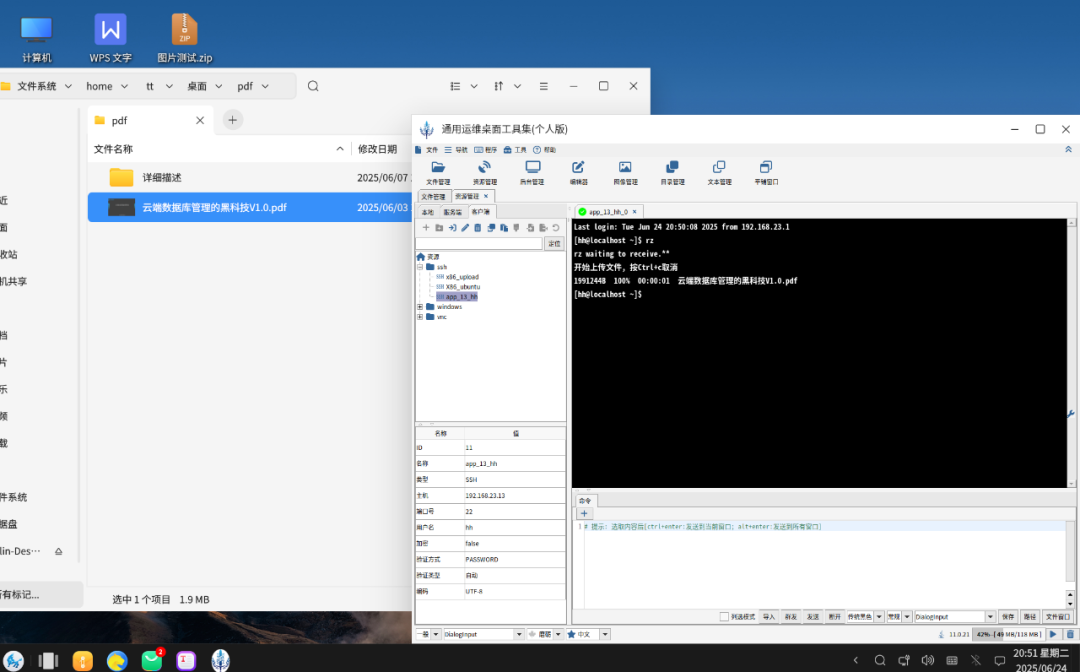 终端窗口拖拽用起来非常方便,直接把操作系统中的文件拖拽到终端窗口中,文件会自动被保存在终端的当前路径下,但是这种方式要求服务器中必须安装rz命令。