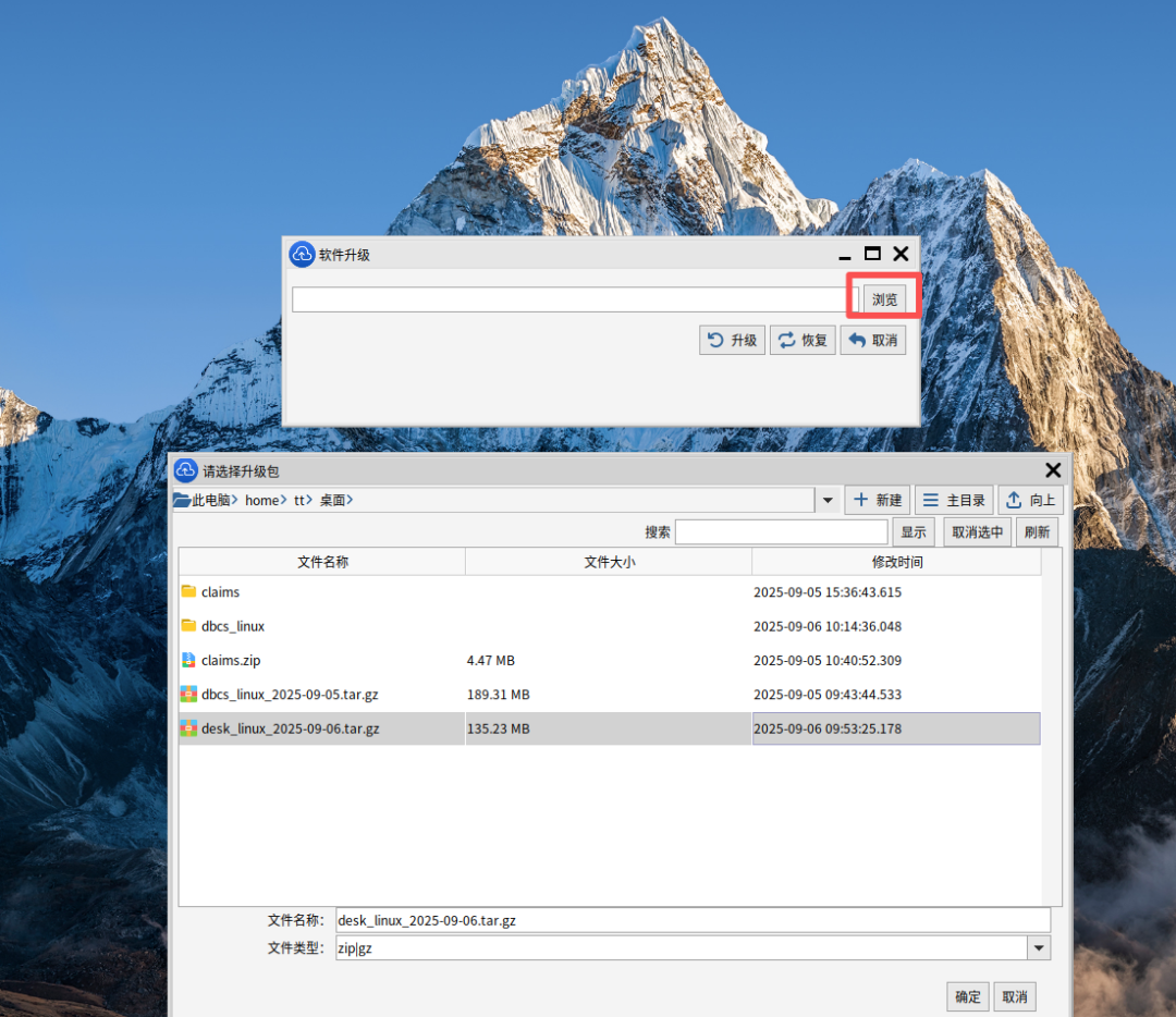 2.在弹出的对话框中,选择tar.gz文件包,然后就可以完成升级