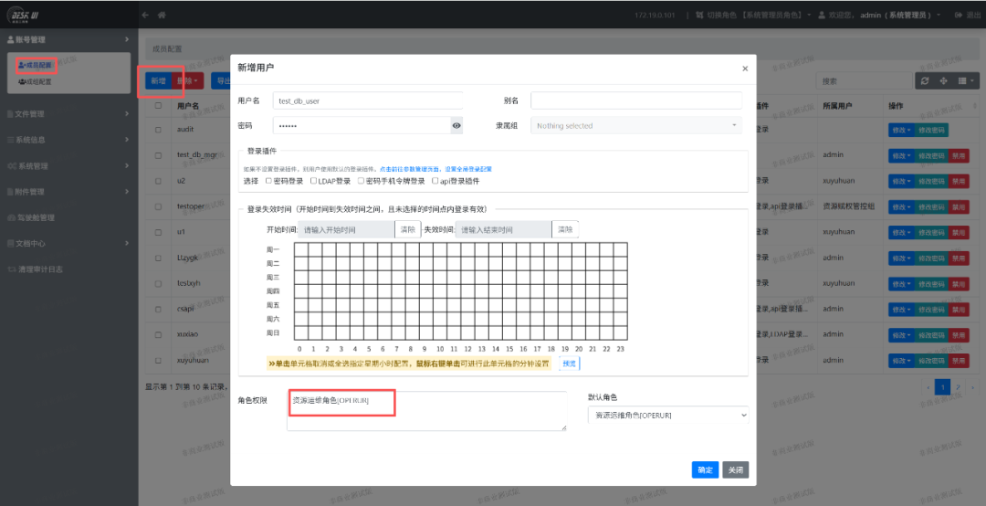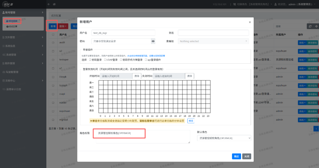 用管理员登录系统后,点击“成员配置”左侧菜单,后点击“新建”按钮。在新增用户对话框中添加用户名(test_db_mgr)和密码,并且给用户选择“资源管控赋权角色”。