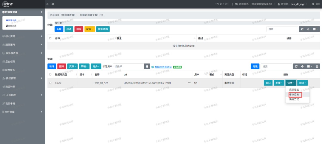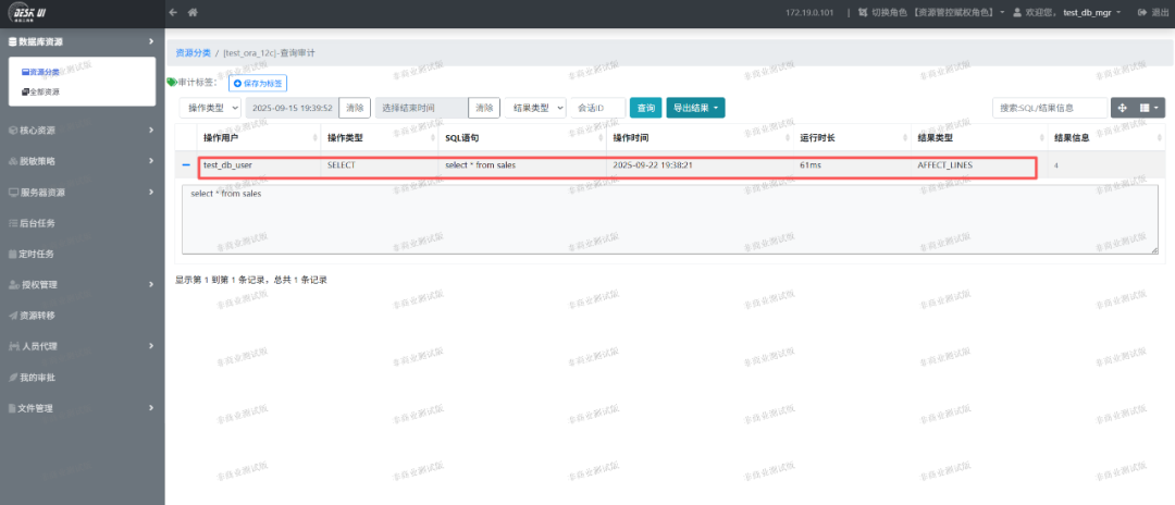 重新使用资源管理员test_db_mgr登录系统后,可以查看自己创建资源的审计。
