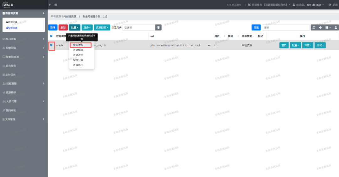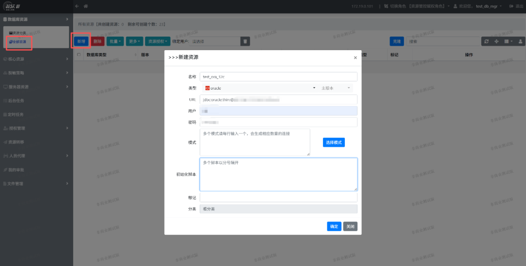 用资源管理员test_db_mgr登录系统后,按照下图方式进行资源创建和授权。