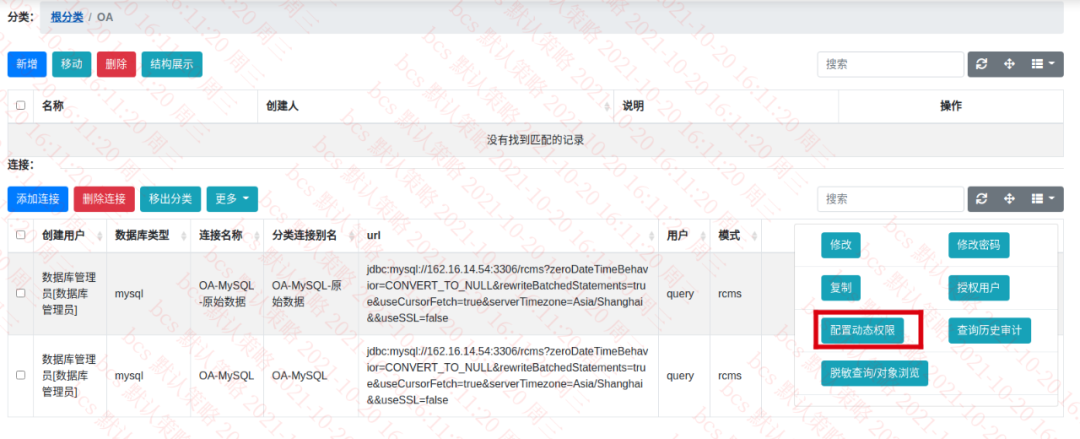 登录 XGuard 管控平台后,在左侧功能菜单中依次点击【数据库管理】→【连接信息管理】。在目标数据库连接的操作栏中,点击【配置动态权限】按钮,进入权限精细化配置页面。