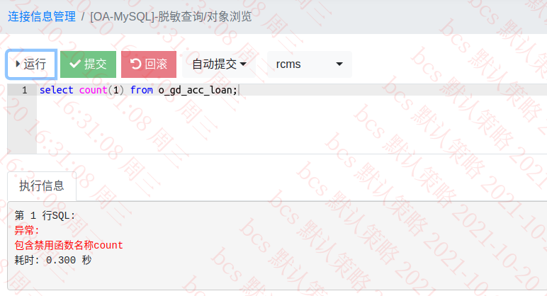 ④ 点击【运行】按钮执行 SQL,此时平台会触发拦截机制,返回执行异常提示: 第 1 行 SQL:异常:包含禁用函数名称 count,证明 count 函数已成功被限制访问。