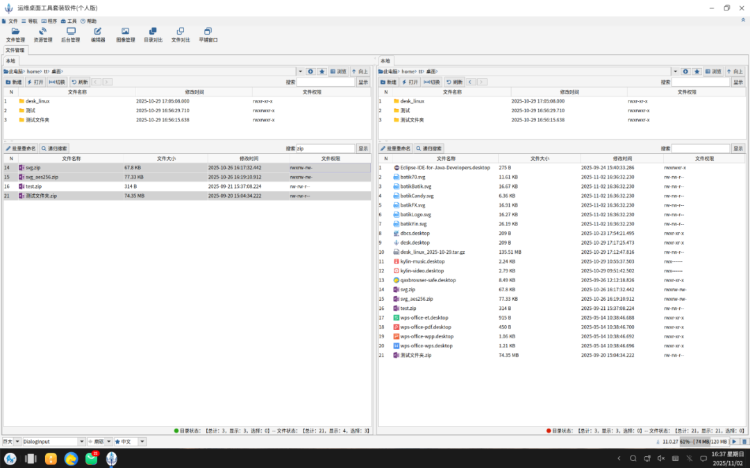DESK的多选更加灵活。DESK支持先过滤再多选,如下图:右边文件为原始状态,如果想删除部分zip文件,大家可以左边的过滤栏中输入zip关键字进行过滤,过滤后再用Ctrl和Shift键+鼠标进行选择。