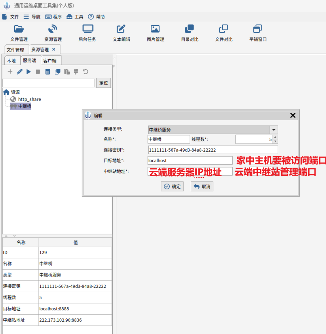在家中电脑上启动DESK后,点击,“资源管理”功能下的“服务端”页签,添加中继桥。注意2点: