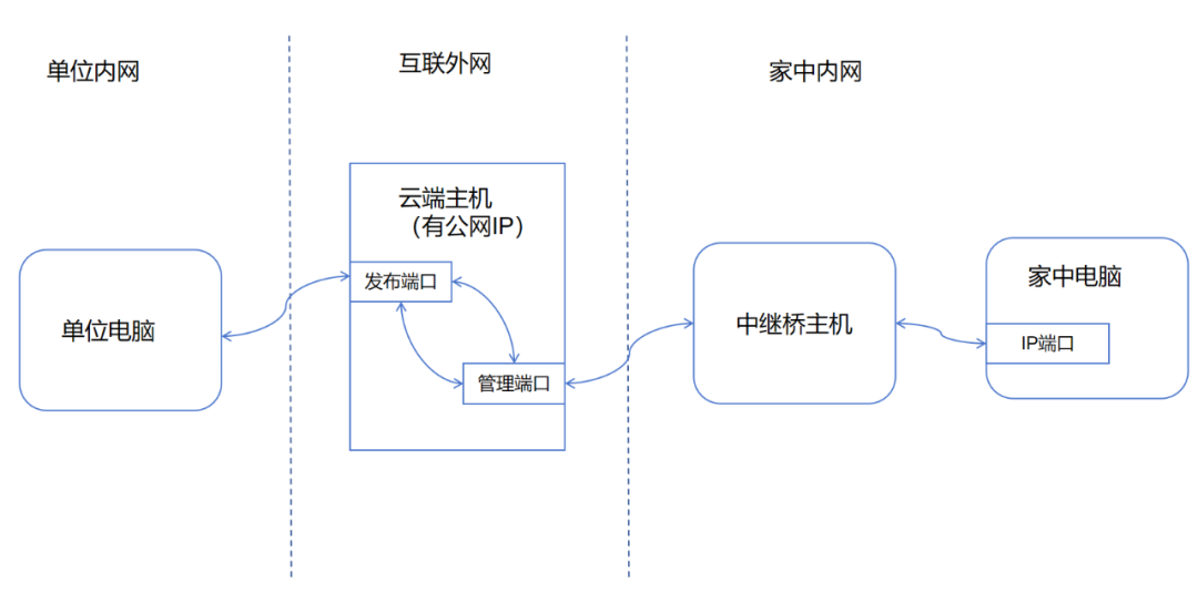 家中的电脑一般来说只能上网,这样的电脑通过路由器分配到类似192.168.X.X这种内网地址,因此一个互联网上的电脑想通过IP地址和端口访问家中的电脑是不可行的,而“FRP内网穿透”技术就是这种场景的桥梁,能够通过中间公网IP地址进行中转,把你家电脑上的某个IP地址和端口映射在公网上,从而实现远程对家中电脑的访问。