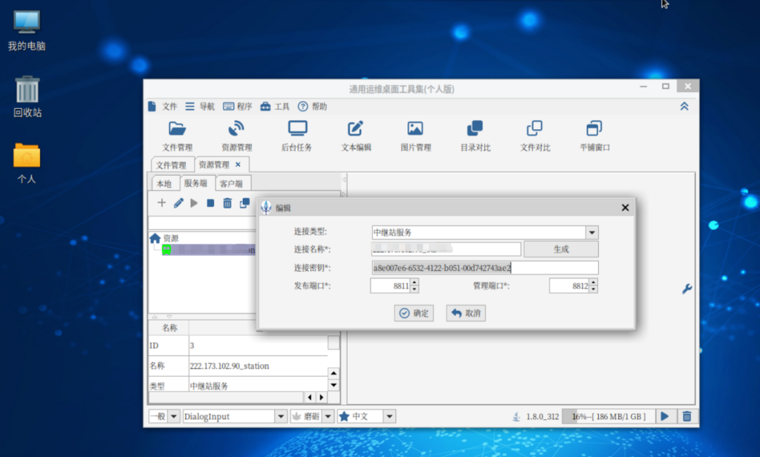 外网主机就是之前咱们从华为、阿里、腾讯上申请的主机,这种主机申请Linux系统的更便宜。申请完成后,要安装VNC,在VNC环境下启动DESK软件。然后点击,“资源管理”功能下的“服务端”页签,添加并且启动中继站,如下图: