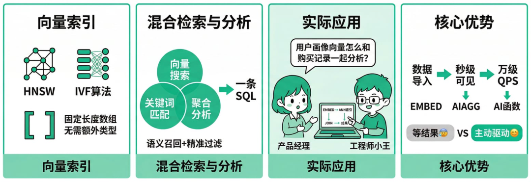 工程师小王直接敲代码演示:“看这条SQL,EMBED函数把文本转向量,ANN索引秒搜相似用户,再JOIN结构化表过滤,最后聚合出推荐列表,整个过程库内完成,不用出库调用外部API。”