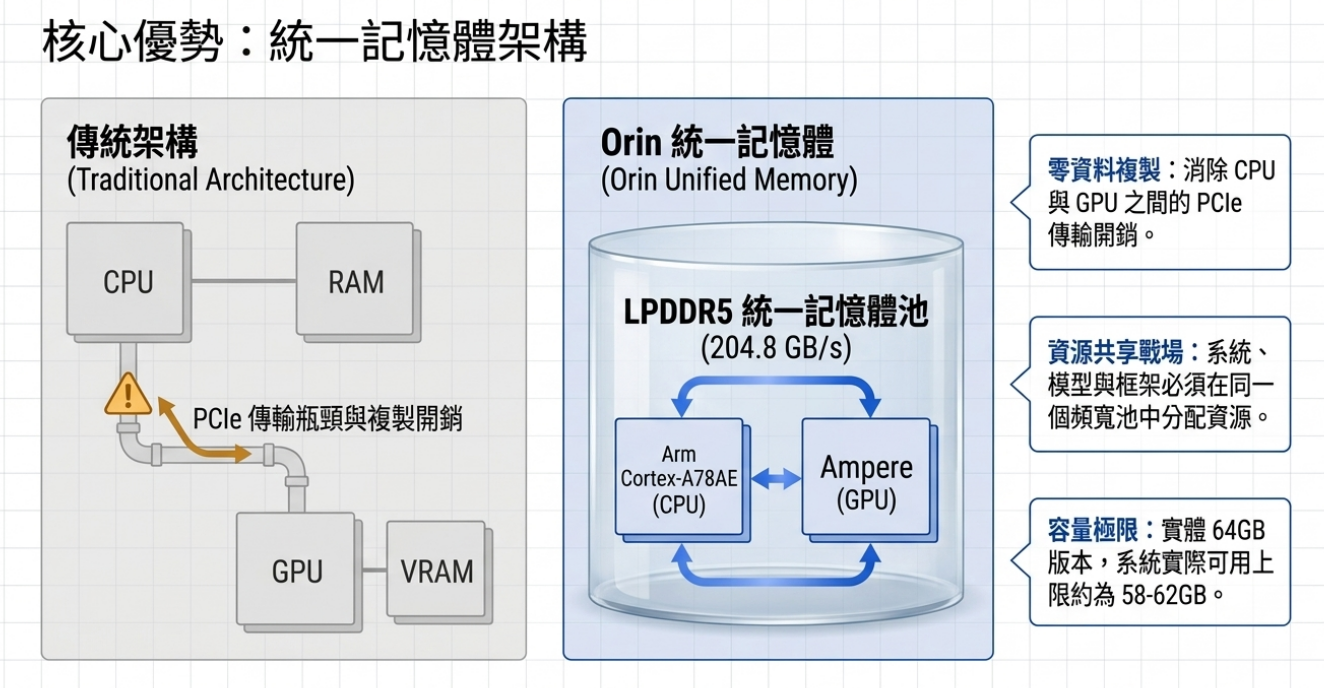 Orin 的内存系统并非传统「CPU 内存 + GPU 显存」分离架构,而是Unified Memory(统一内存)。