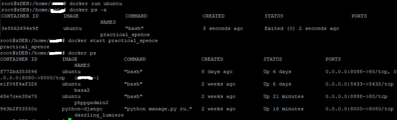 嗨,我和码头有问题。我正在s390x Debian上使用它,一切正常,但现在我无法启动容器。旧容器正在工作,但是当我使用docker run ubuntu创建新容器时,我正在尝试docker start [CONTAINER],我的容器没有启动。当我使用docker ps -a时,我已经拥有了所有的容器,但是当我使用docker ps之后,我就看不到我的新容器了。你可以从可控硅上看到。我创建了名为practical_spence和ID 3e8562694e9f的容器,但是当我使用docker start时,它没有启动。请帮帮忙。