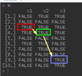 m <- matrix(sample(c(F,T),30,T),ncol = 3) ; colnames(m) <- paste0("x",1:ncol(m))