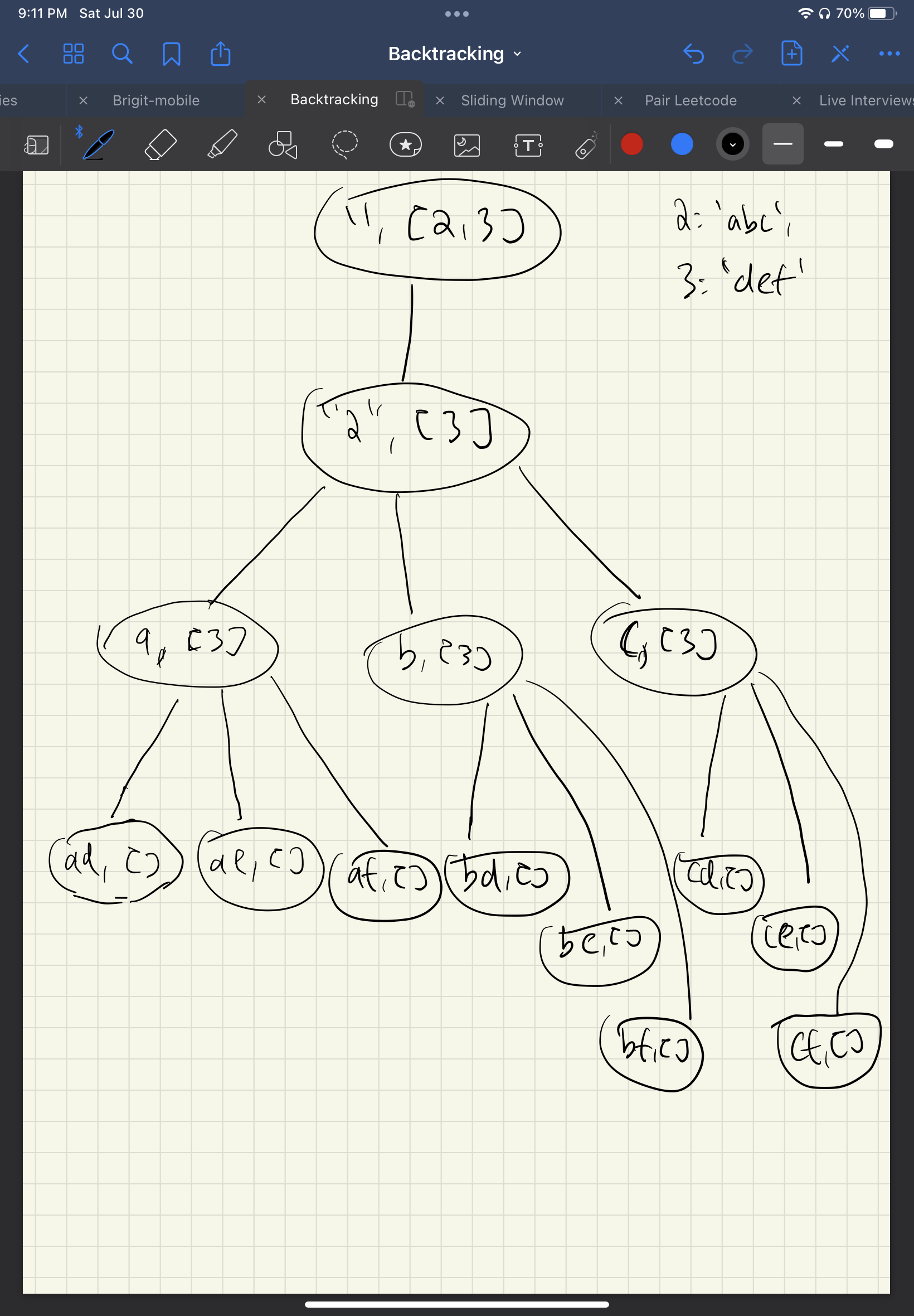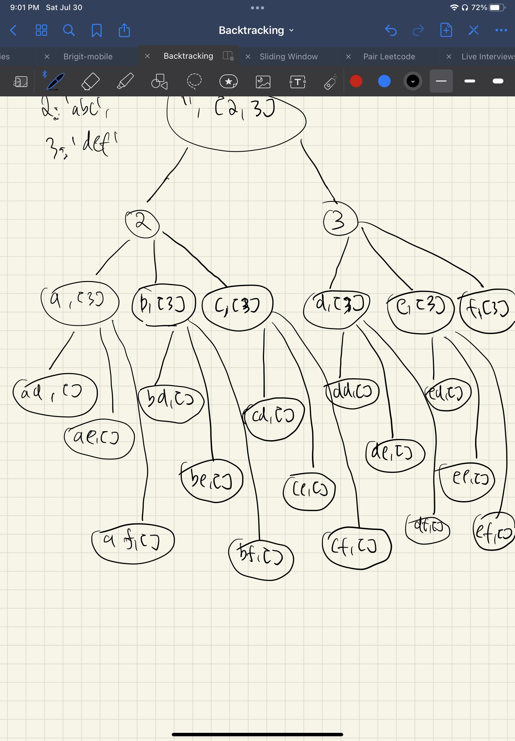 return combinations您将把backtrack("",0)推到调用堆栈中。在第一个for-循环中,它将添加"a“,然后调用backtrack("a",1)。现在在backtrack("a",1)函数中,它将为"def“运行for -循环,并将"def”中的每个字母运行到"a“,因此您将创建"ad af”。在完成这个for循环之后,它将对"b“和"c”执行相同的操作。