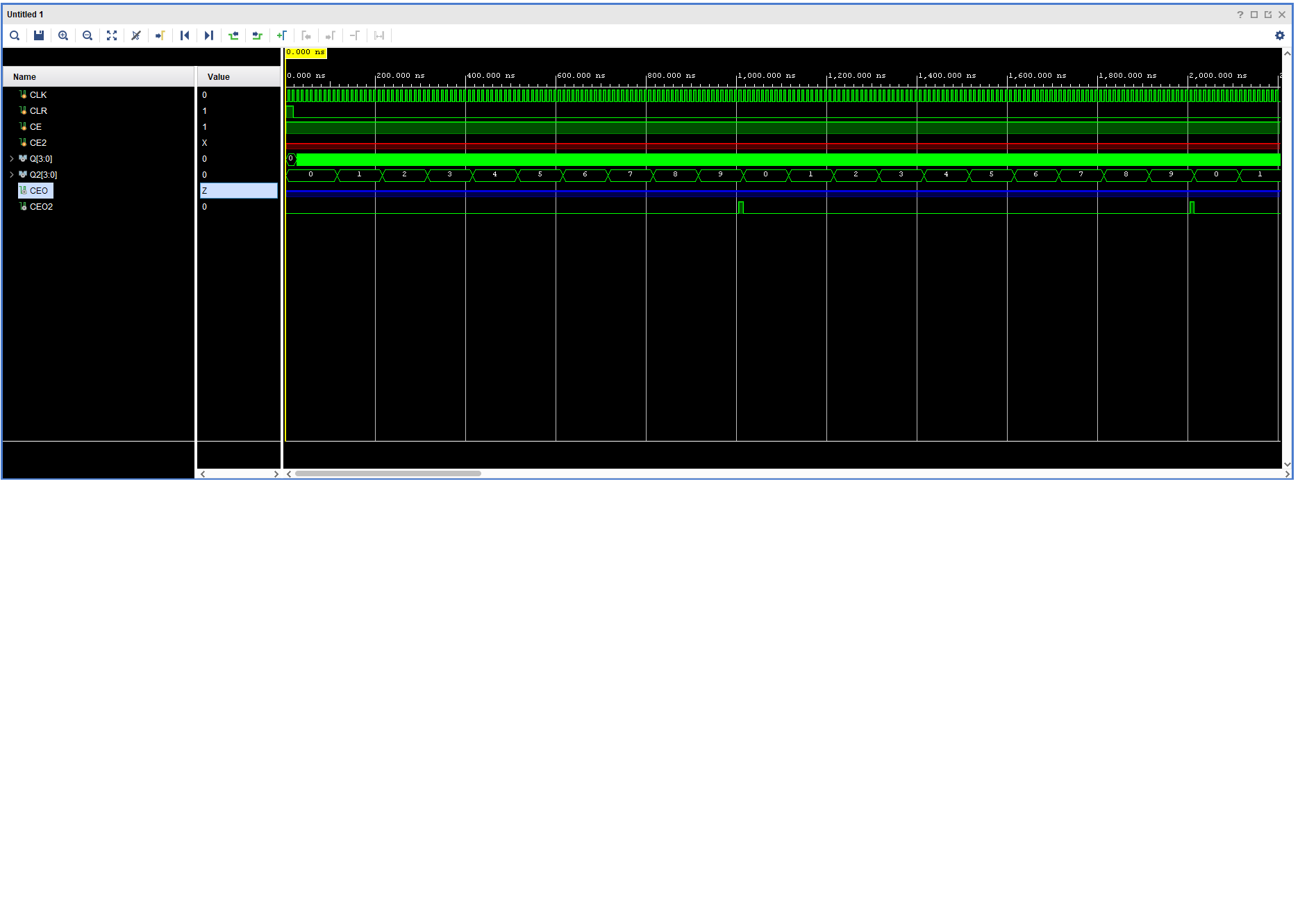 我意识到,这可能很容易解决,但我无法找到一个办法,使它的工作。我的问题是,在这种情况下,我如何获得CE2和首席执行官的视觉信号?我知道通过查看RTL计划,CE2和首席执行官并没有连接到引脚。我就是不能把他们联系起来。当第一个计数器到达9时,CE2应该打开,但在波形上,它总是X。当Q为9时,首席执行官应该打开,而在波形上,总是Z。这个电路只是为了自学。
