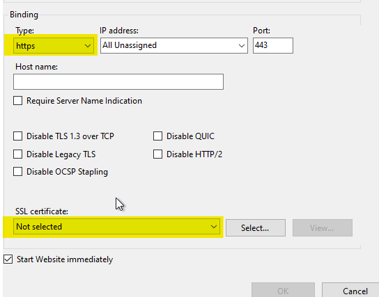 在IIS上部署Django时,在添加网站时选择https和证书。