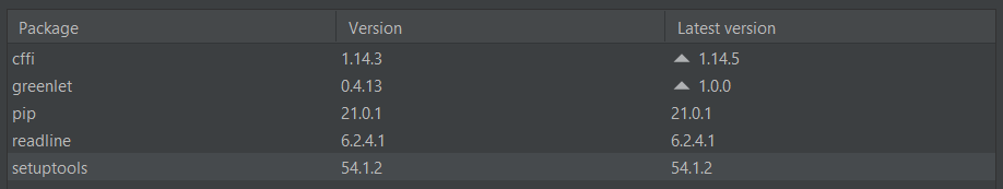 现在,在“设置”、“设置”、“项目: xx”、"Python解释器“中,我从下拉菜单中选择了PyPy解释器。出现了一个警告:我没有安装python打包工具,所以我点击了链接来安装它们。他们安装并欢迎我使用以下软件包: