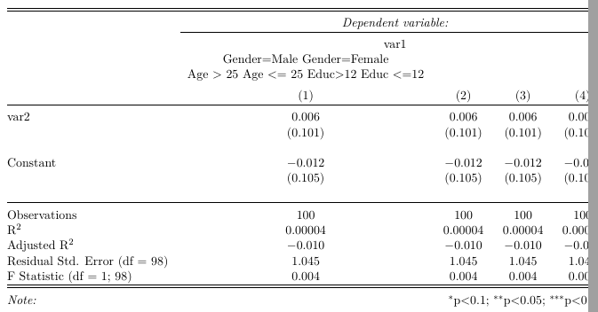 我正在尝试获取多个列标签,但我在从stargazer()解析它时遇到了问题。我试图在不同的子样本上显示不同的模型,并在列名中描述分区。但是,它没有正确地显示它。