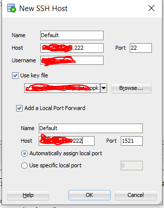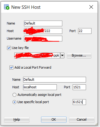 ...在屏幕截图中,我希望第一个主机值是您的远程主机,即代码中的任何`sshHost‘;SSH在端口22上联系的那个主机。第二个主机和端口值是SSH会话,而不是由您访问数据库侦听器的方式。(“localhost”有远程服务器;它将本地主机视为本地主机,并在环回地址127.0.0.1上到达)。WIth单选按钮选择,SSH连接正在分配它自己的本地端口,并连接到它,您不需要真正知道它有什么值。